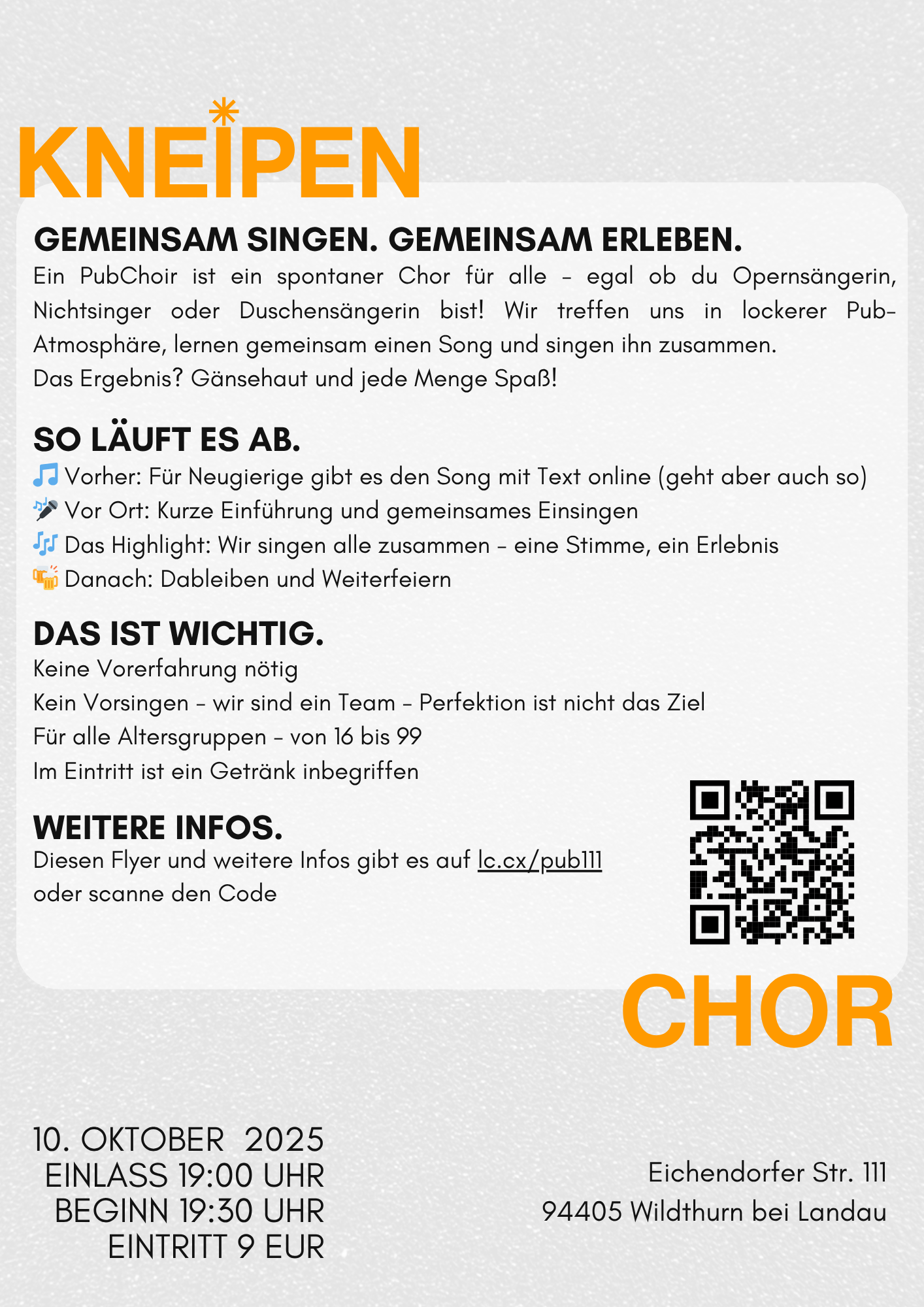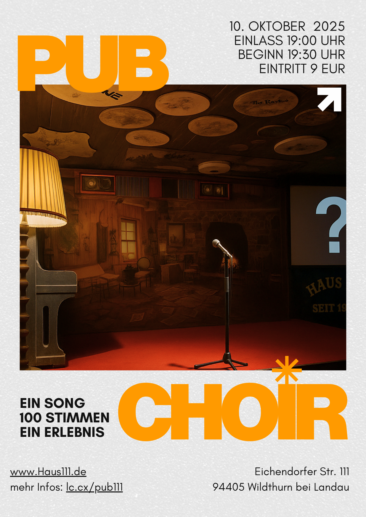 « Alle Veranstaltungen Diese Veranstaltung hat bereits stattgefunden. Haus 111 – Pub Choir 10. Oktober von 19:00 €9, « Tainted Thunder Reason 2 Rock » Haus 111 – Pub Choir mehr Infos: lc.cx/pub111 Zum Kalender hinzufügen Google Kalender iCalendar Outlook 365 Outlook Live Details Datum: 10. Oktober Zeit: 19:00 Eintritt: €9,